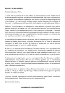 Bogotá, 3 de julio de 2025. Desde su cuenta de X, la hoy excanciller Laura Sarabia presentó su renuncia a su cargo como Ministra de Relaciones Exteriores, según ella por diferencias con las últimas decisiones que se han tomado en el Gobierno, presuntamente relacionadas con el polémico caso de los pasaportes.